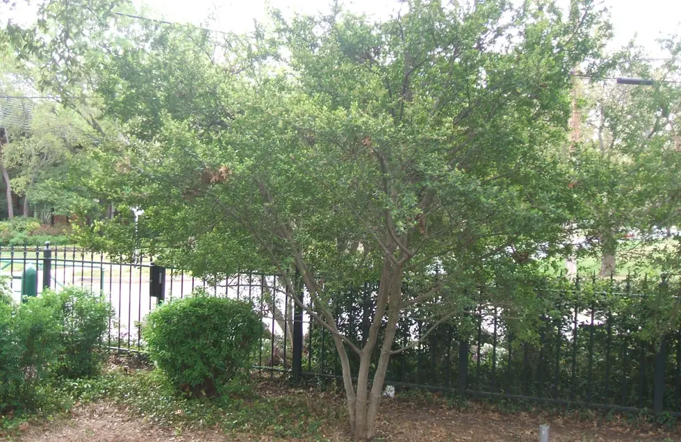 Yaupon holly is an evergreen shrub or small tree reaching 5–9 meters tall, with smooth, light gray bark and slender, hairy shoots. The leaves are alternate, ovate to elliptical with a rounded apex and crenate or coarsely serrated margin, 1–4.5 cm long and 1–2 cm broad, glossy dark green above, slightly paler below. The flowers are 5–5.5 mm diameter, with a white four-lobed corolla. The fruit is a small round, shiny, and red (occasionally yellow) drupe 4–6 mm diameter containing four pits, which are dispersed by birds eating the fruit. The species may be distinguished from the similar Ilex cassine by its smaller leaves with a rounded, not acute apex